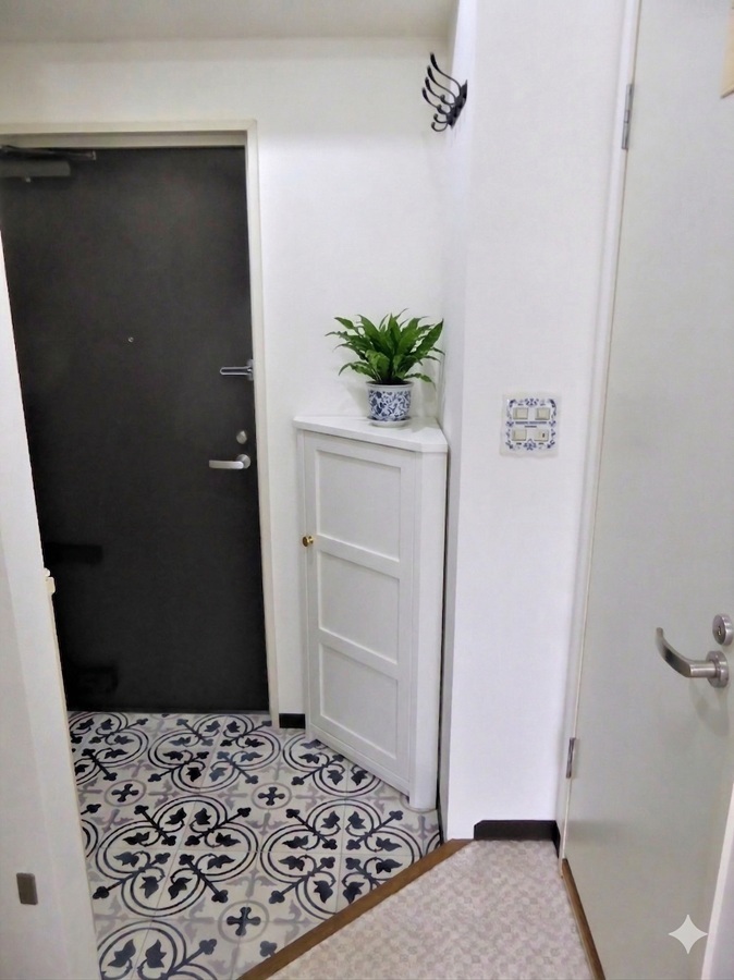 これだけ広い「玄関床」なら、履かない靴を脱ぎ散らかそうとは思わないでしょう。 アパート暮らしの場合、ドア幅ぐらいしかない狭い玄関床がほとんどですが、仕事から帰ってくるたびに、狭い玄関に靴が重なって散らばった生活感のある、気が萎える、なんか「みじめさ」を感じる一人暮らしとは ”さようなら”です。 シューズボックスの前の空間が、ごみ捨ての時に一時的にごみを置いたりできるので、何気に便利です。