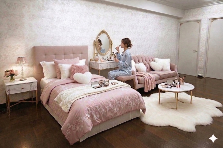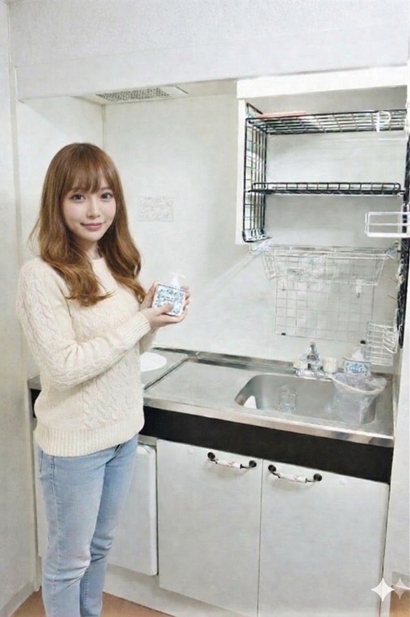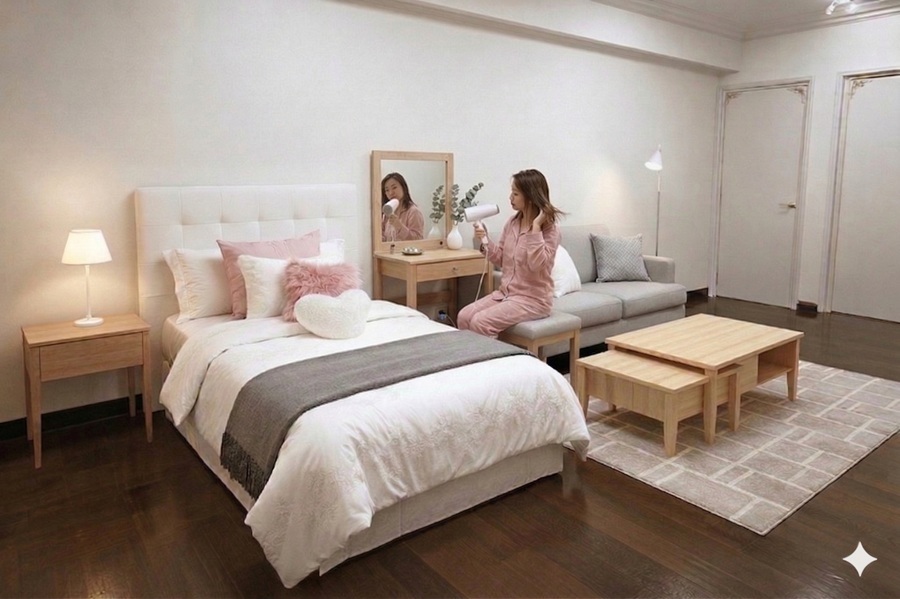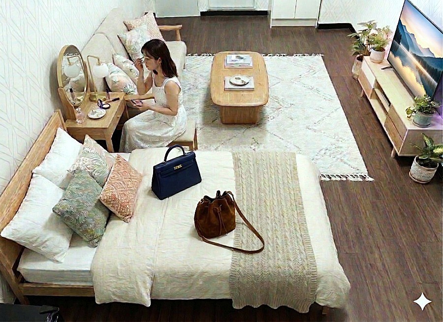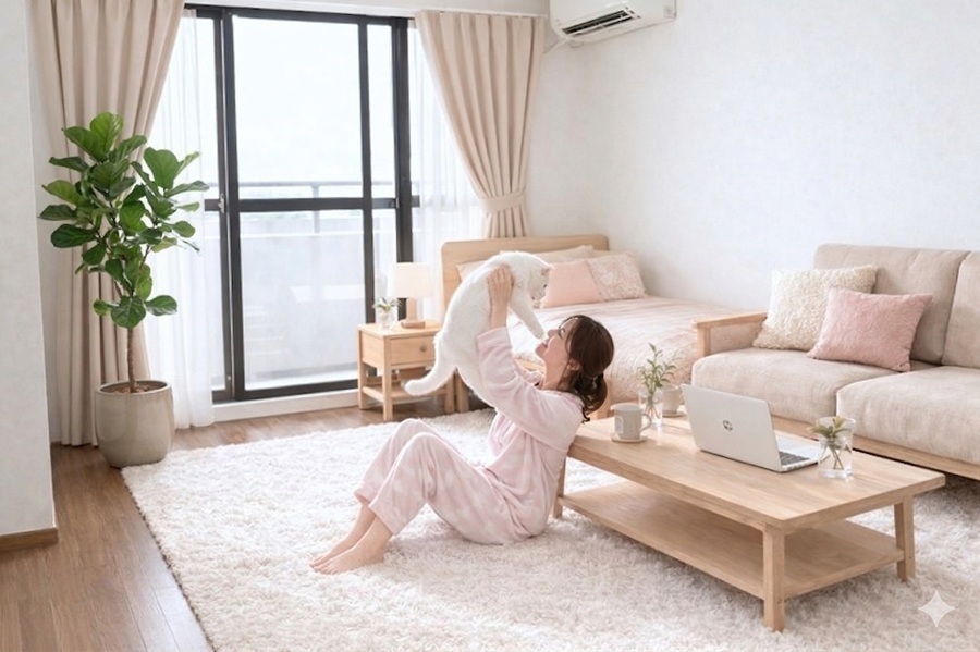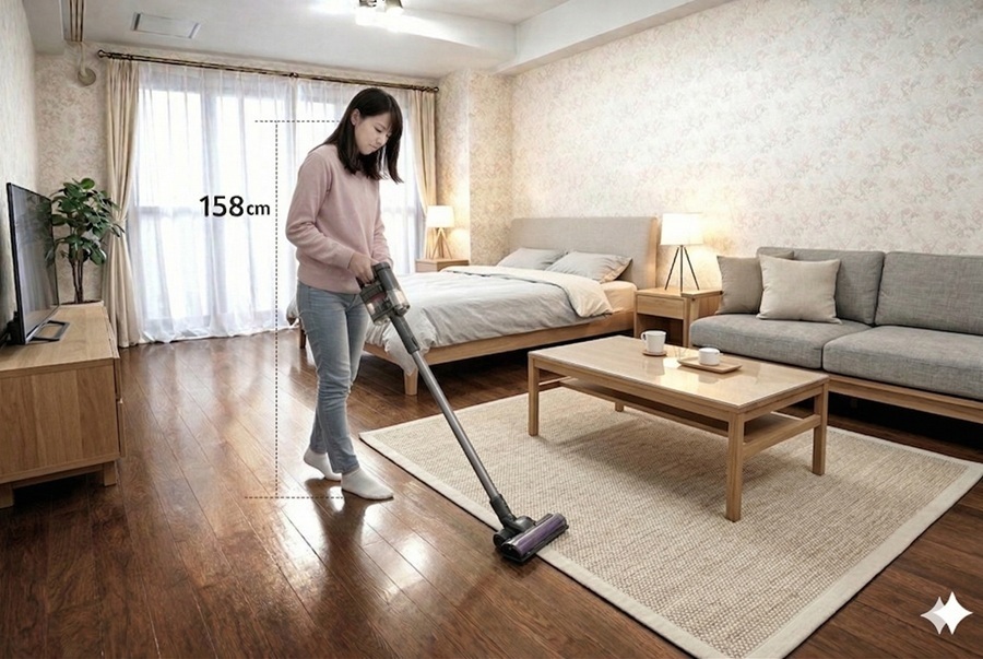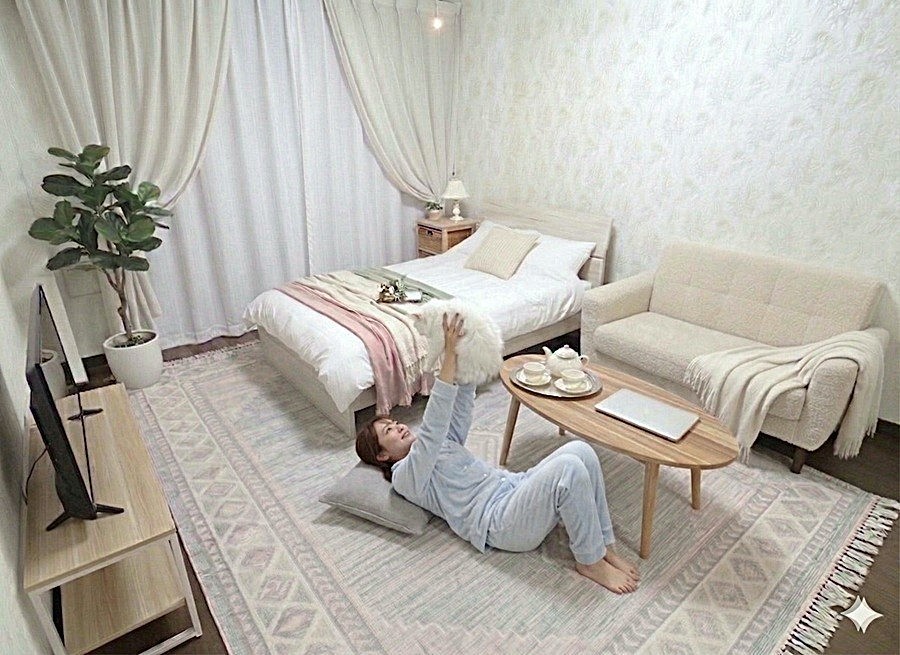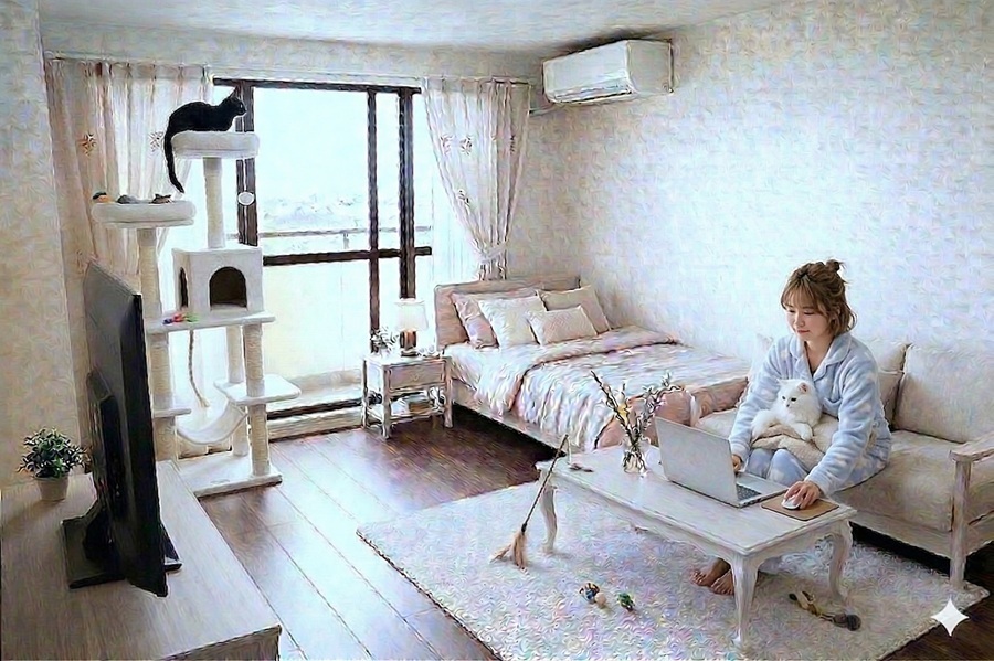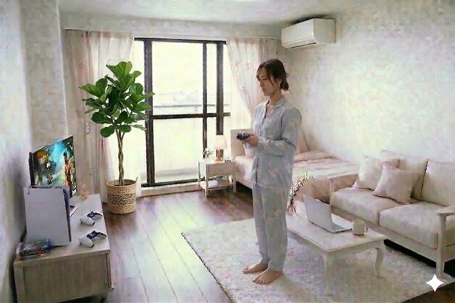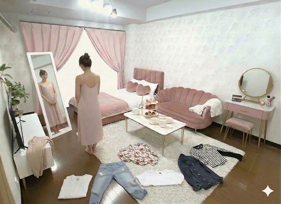 AI生成画像成の女性(20代女性の平均身長158cmで生成)のいる位置によって、女性の大きさも変わっていますので、部屋のサイズ感が判りやすいです。