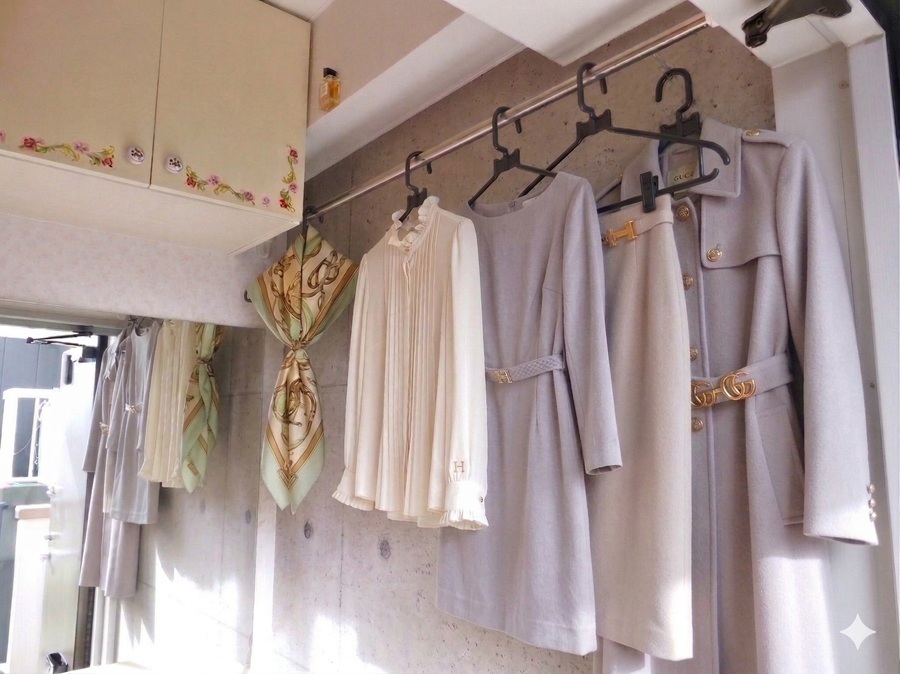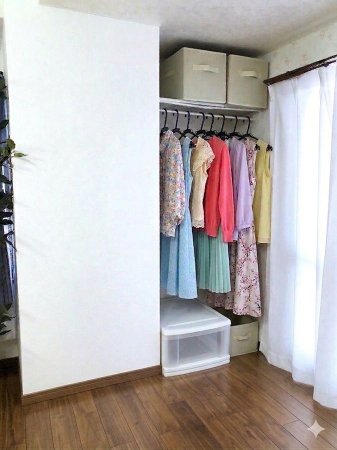 奥にメタルラックを置き、ハンガーポールを設置すればクローゼットに変身。 収納場所が増えます。