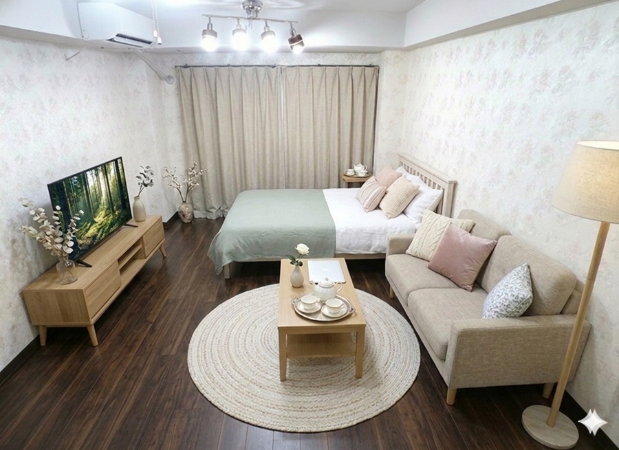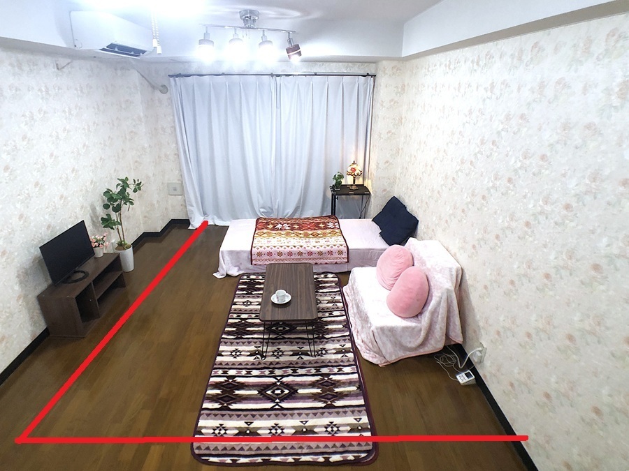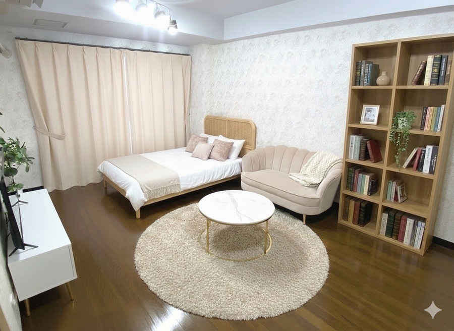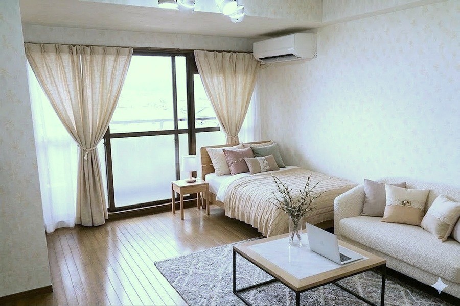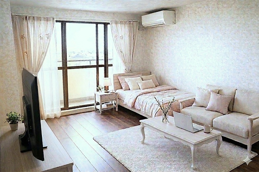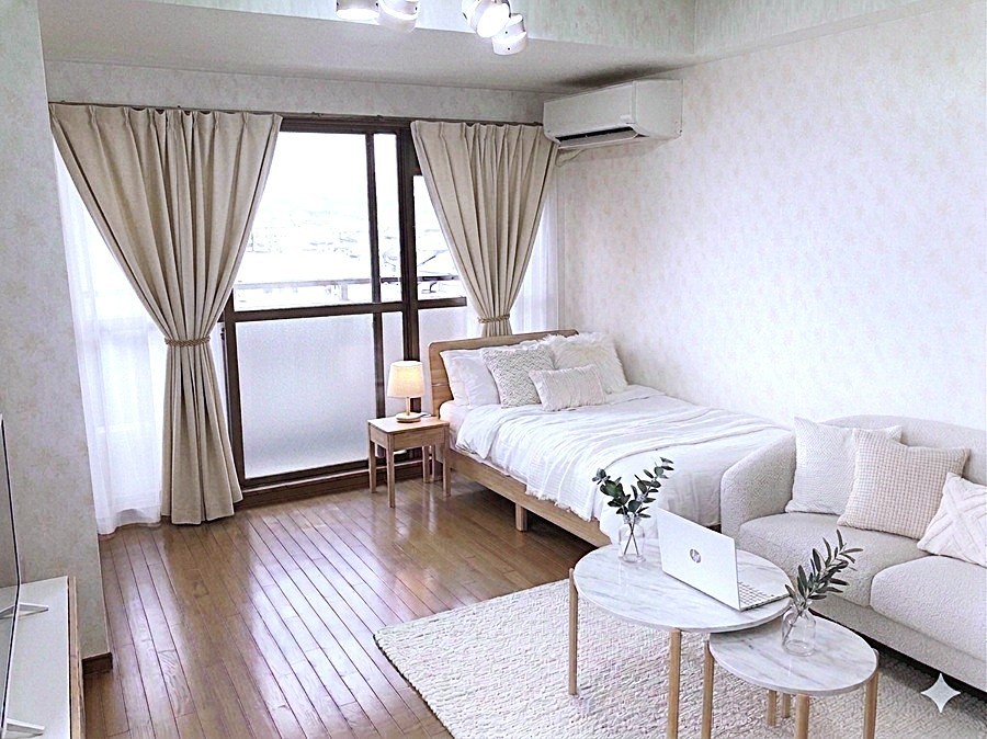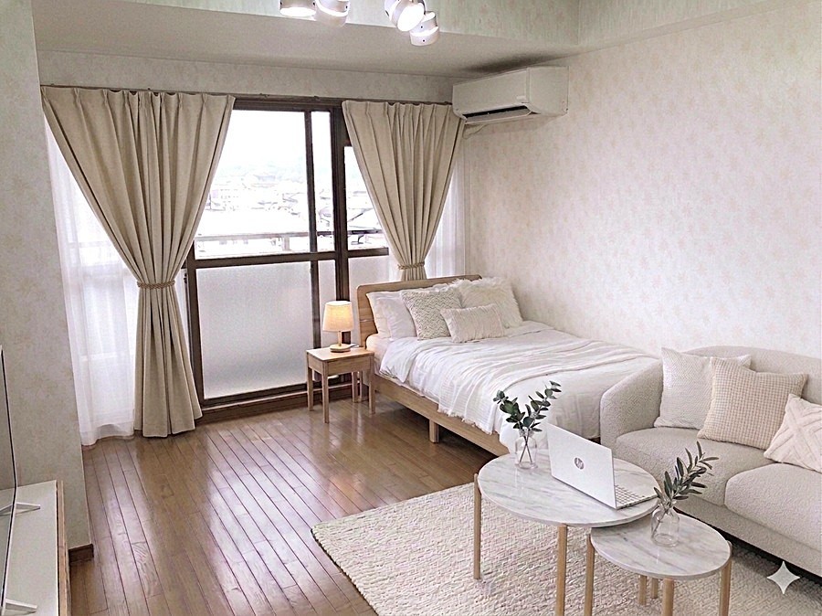 家具の色、デザイン等好みは色々あるでしょうが、女性の入居者の方が多いいので、色など女性よりにしてあります。 色味の好みは十人十色ですので、あくまで一つの提案ですので、家具を置いた場合のサイズ感のイメージの検討にご覧ください。
