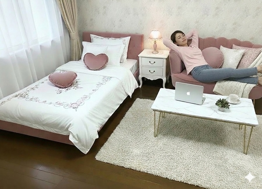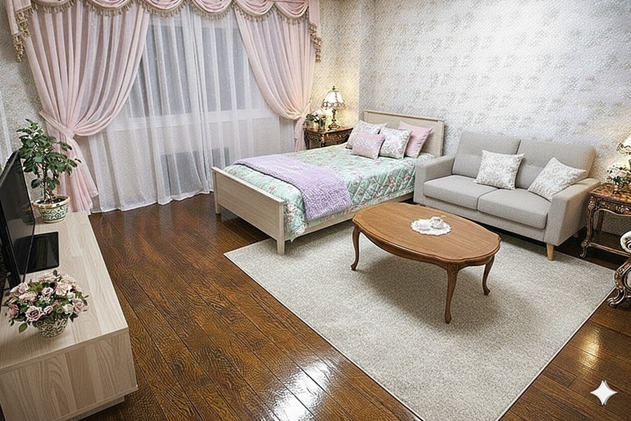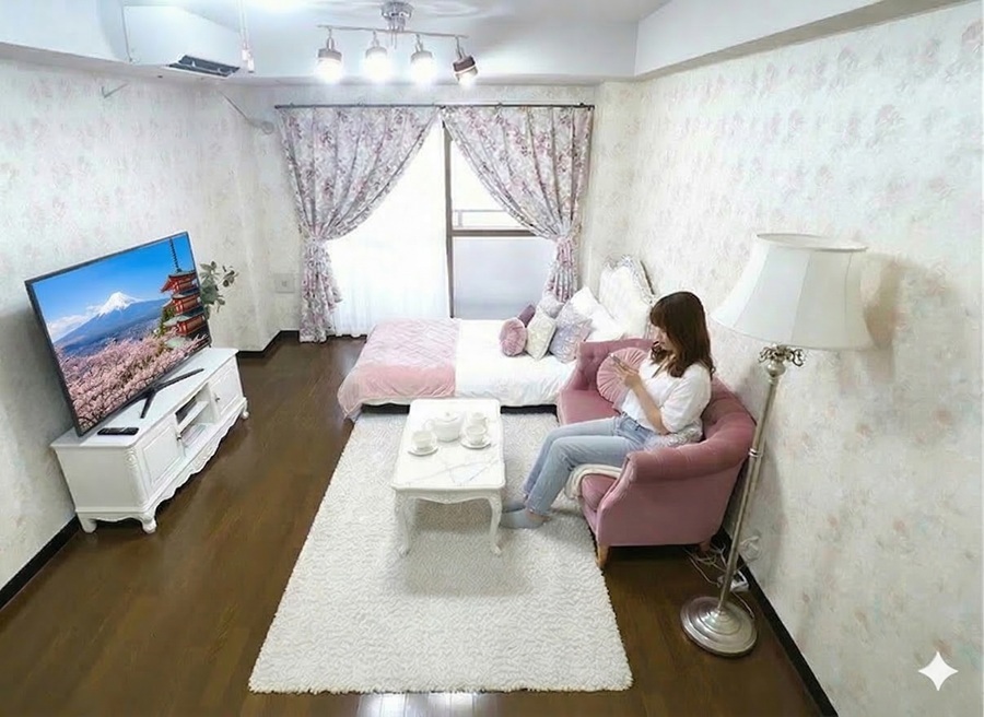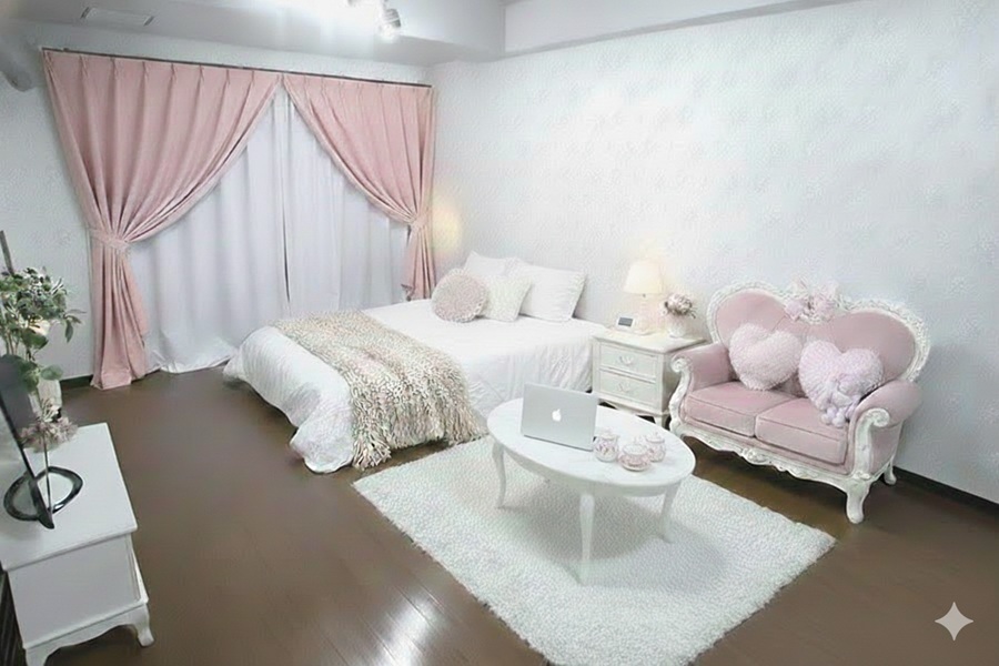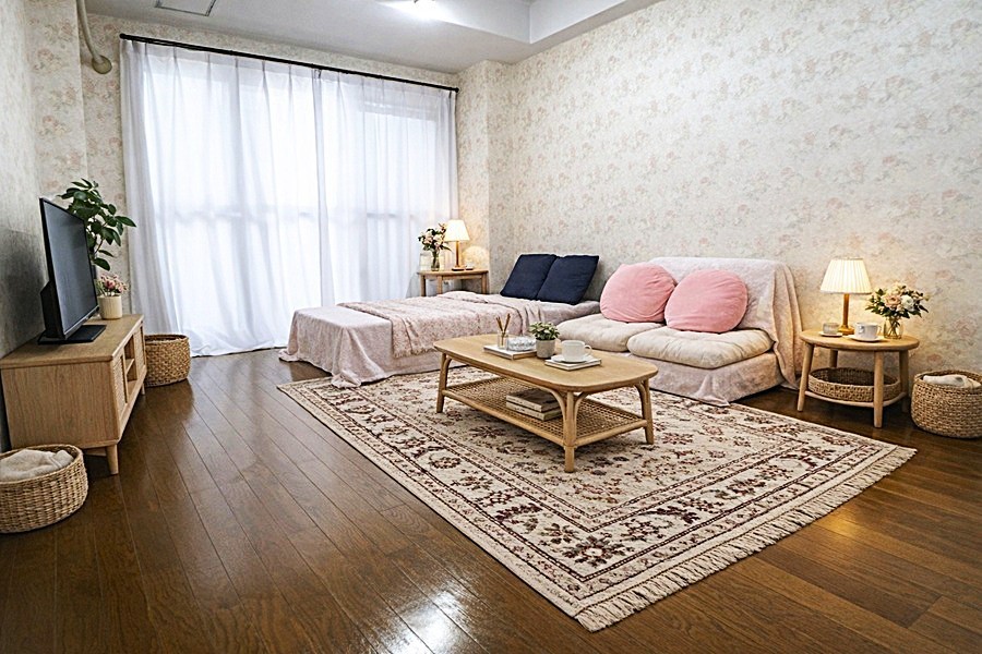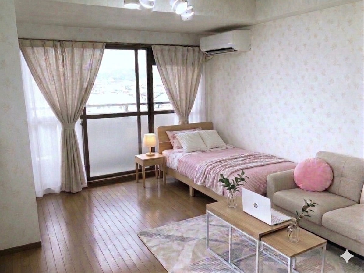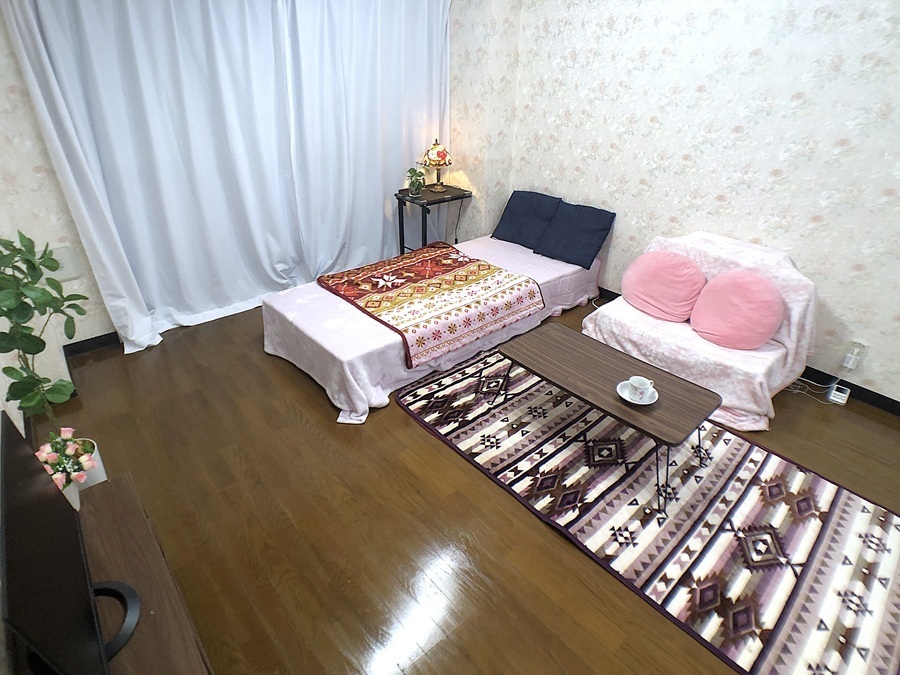 家具の色、デザイン等好みは色々あるでしょうが、女性の入居者の方が多いいので、色など女性よりにしてあります。 色味の好みは十人十色ですので、あくまで一つの提案ですので、家具を置いた場合のサイズ感のイメージの検討にご覧ください。