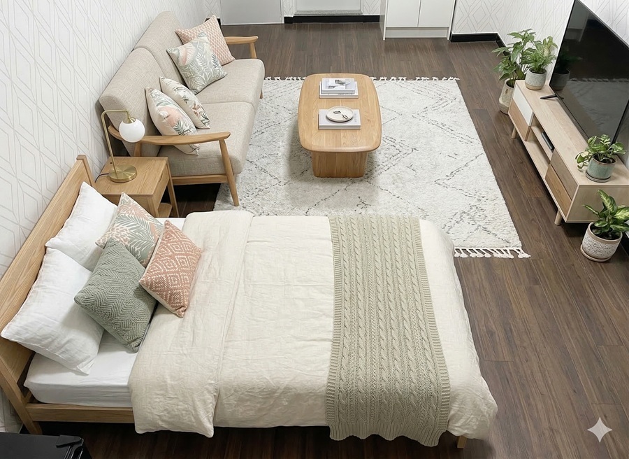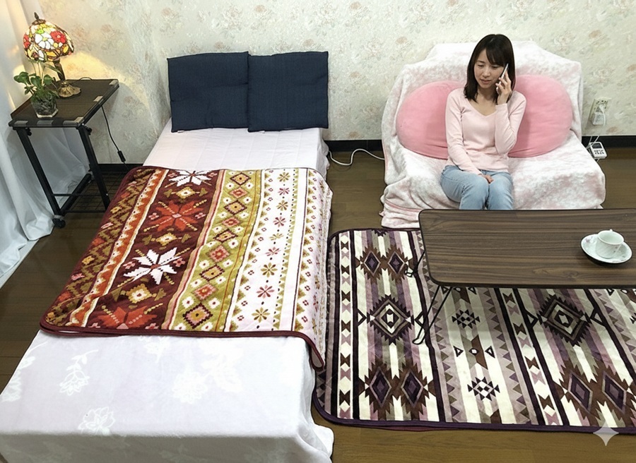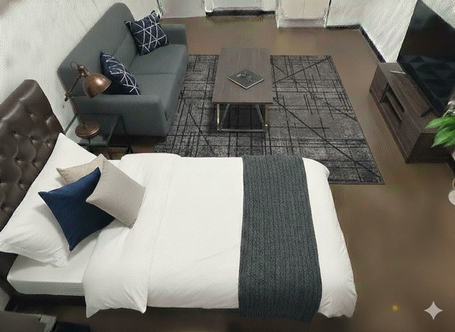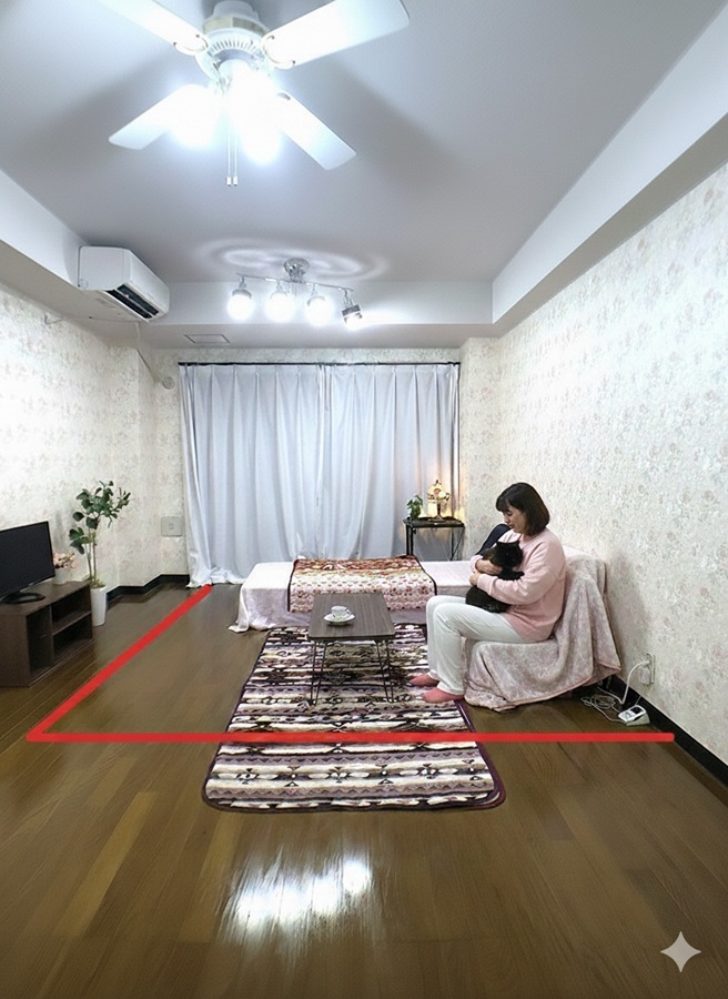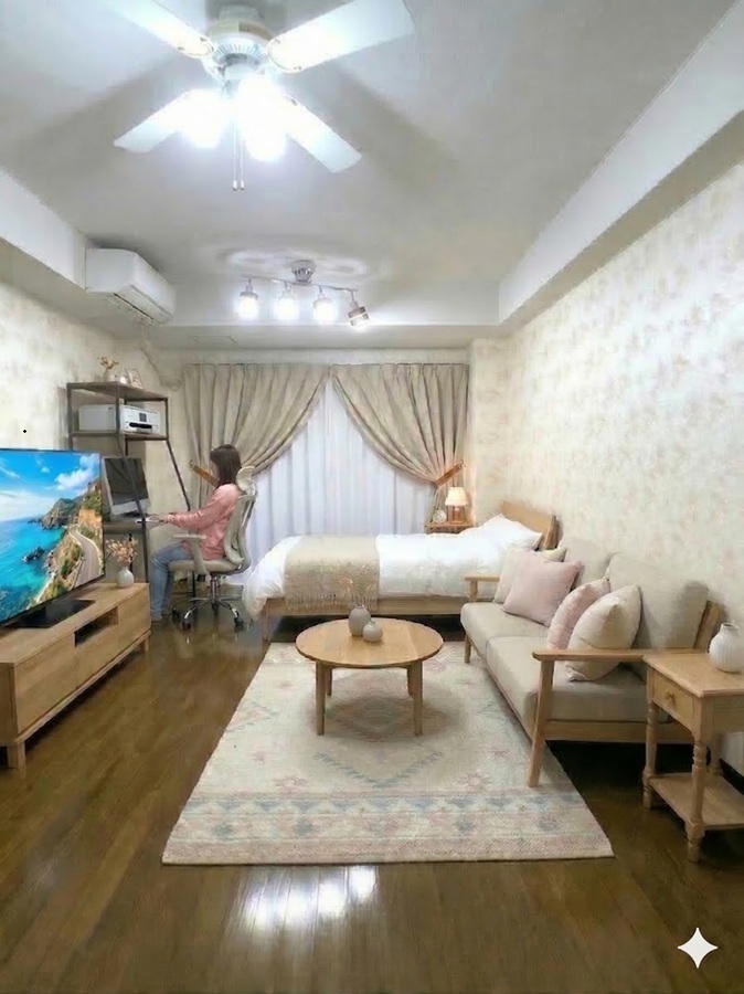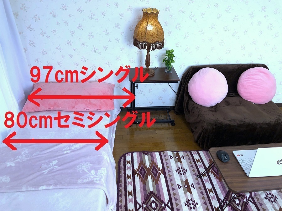 セミシングルベッド(長さ190cm、幅80cm)、1人掛けソファー(幅座面80cm、奥行き70cm)、テーブル(幅80cm、高さ31cm、奥行40cm)24インチTVを置いたTV台(幅73cm、高さ36cm、奥行30cm)、リモートワーク等のデスク、チェアー、床に敷くラグ(幅100cm、長さ195cm)、観葉植物(高さ約105cm)を設置してある画像を何枚か掲載してあります。