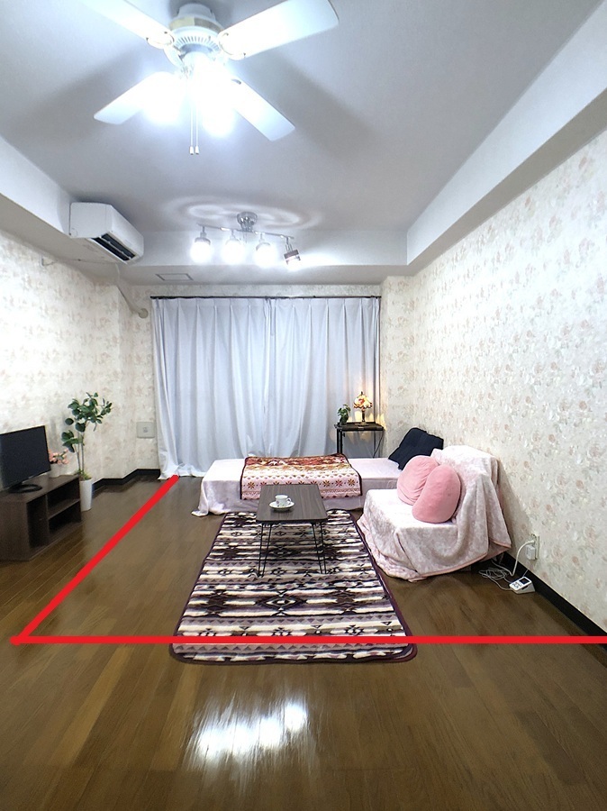 10帖の広さを6帖のサイズと比べてみました。 赤ラインの内側が6帖サイズの面積です。 おもに東日本の賃貸で使用の【団地間】サイズ約340cm×255cmサイズです。