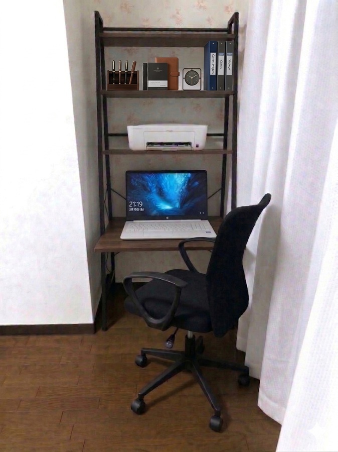 この柱の空間サイズは、奥行き44センチ、横幅77センチです。 リモートやデスクで仕事をする方は、スチールラックを置いて70cmのデスクを置くと、収納場所にもなり無駄なく有効に利用できます。