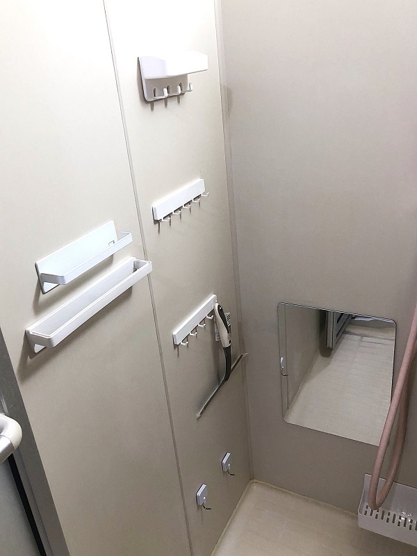 他の賃貸には付いていない、好きな位置に移動できる「タオル掛け」「フック」「シャンプー置きラック」「石鹸置き」。(女性限定)