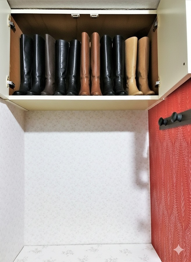上下27足収納可シューズボックス。 上にはロングブーツを立てて収納できます。 下のシューズボックス下の空間にも3足収納できます。