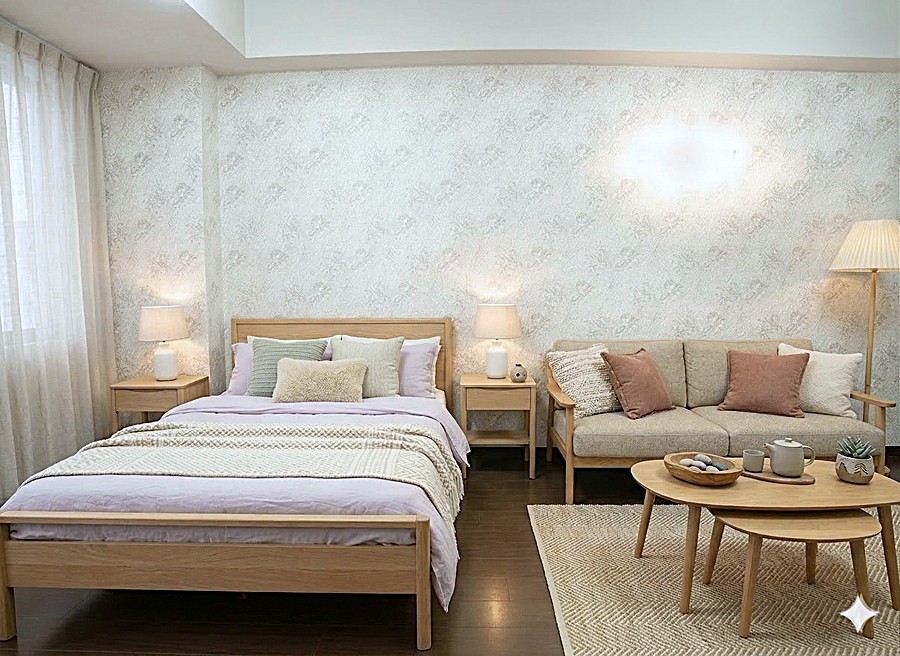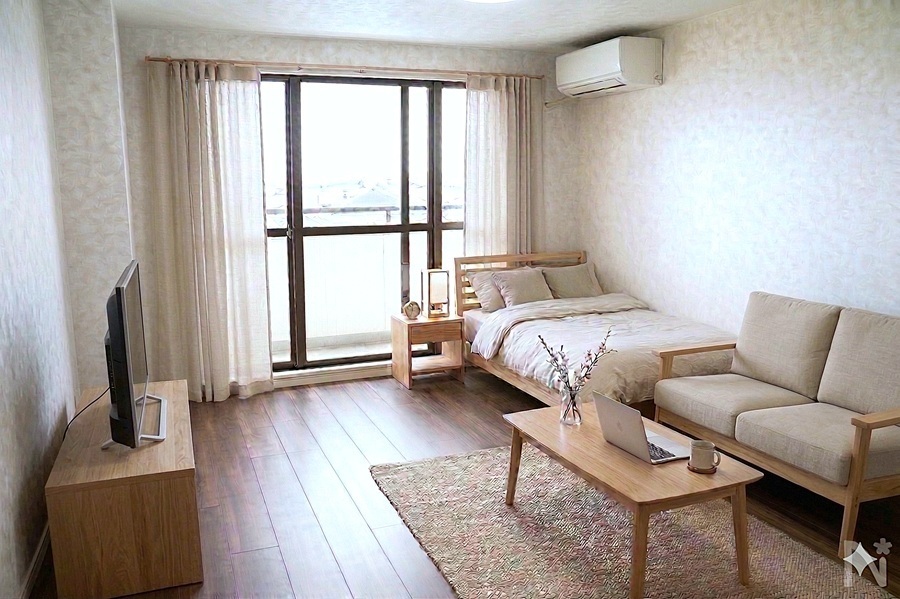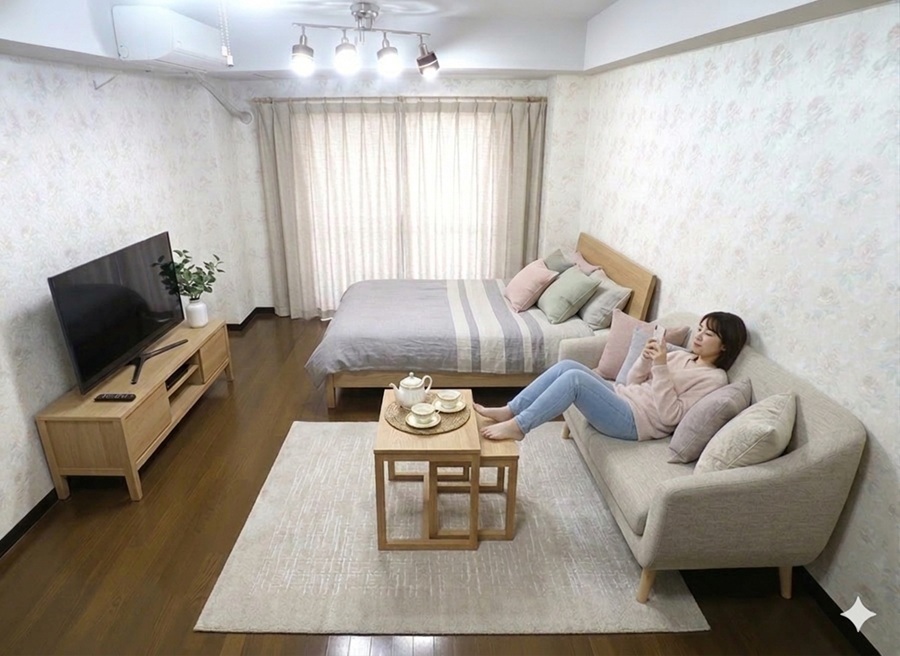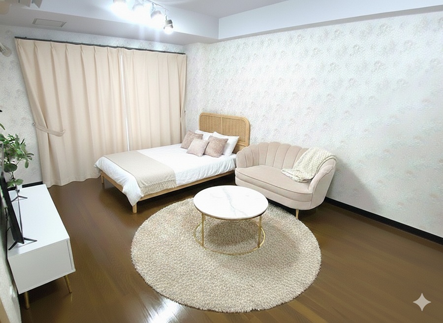 306号室は内覧時に家具を置いたままです。 家具類は軽く移動できますので、内覧時に設置場所を変えて部屋の感じを確認したり、実際にベッドに横になったり、ソファーに座った目線での雰囲気など、実際に住んでいるかのような生活感を確認できます。