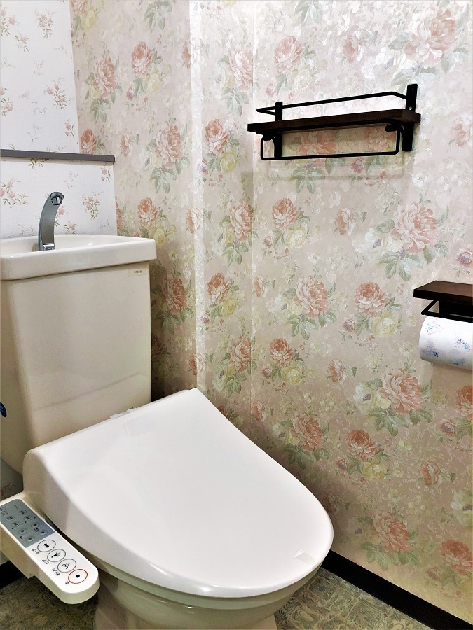 あったほうがいい方には、捨てるのがもったいない余った壁紙や床材をトイレの棚の上の飾りクロスとして四枚ご用意。 今日は何にしようかな。・・・(女性限定)