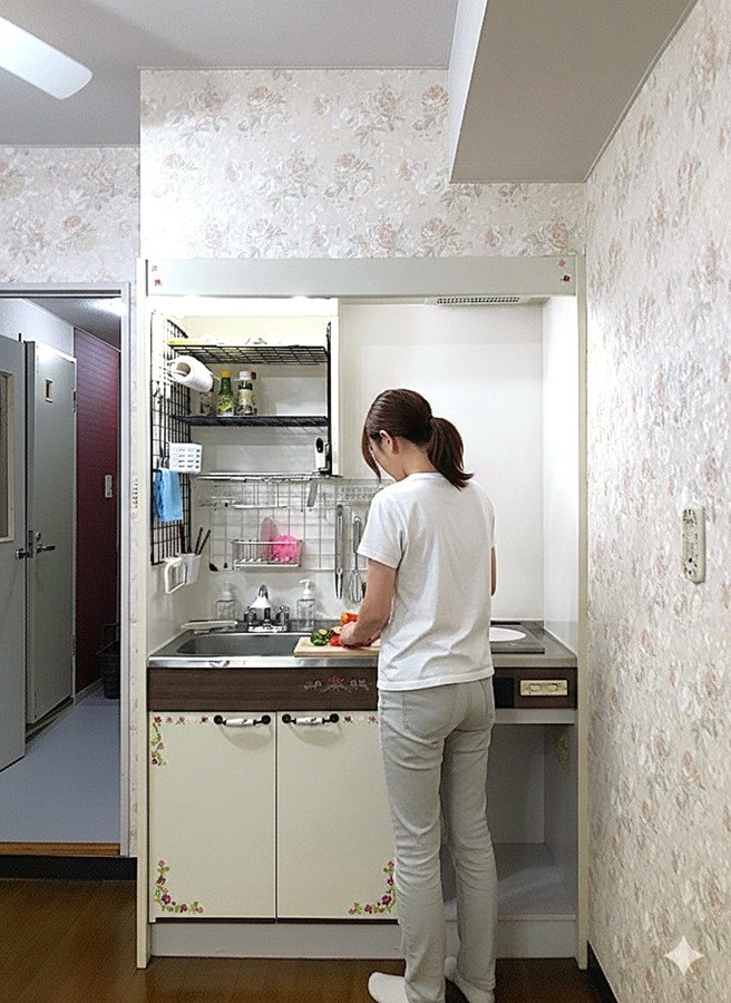 奥の冷蔵庫置き場を、クローゼット/収納として使い、冷蔵庫、収納棚をキッチンの後ろに置き、レンジを置きカウンターのように使うこともできます。