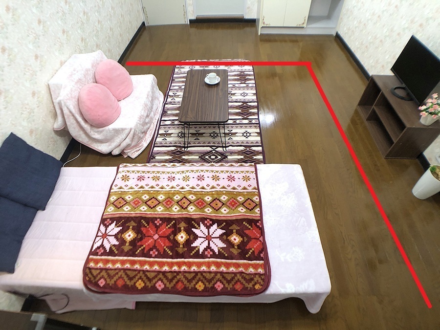 10帖の広さを6帖のサイズと比べてみました。 赤ラインの内側が6帖サイズの面積です。 おもに東日本の賃貸で使用の【団地間】サイズ約340cm×255cmサイズより少し広めに置いてみました。
