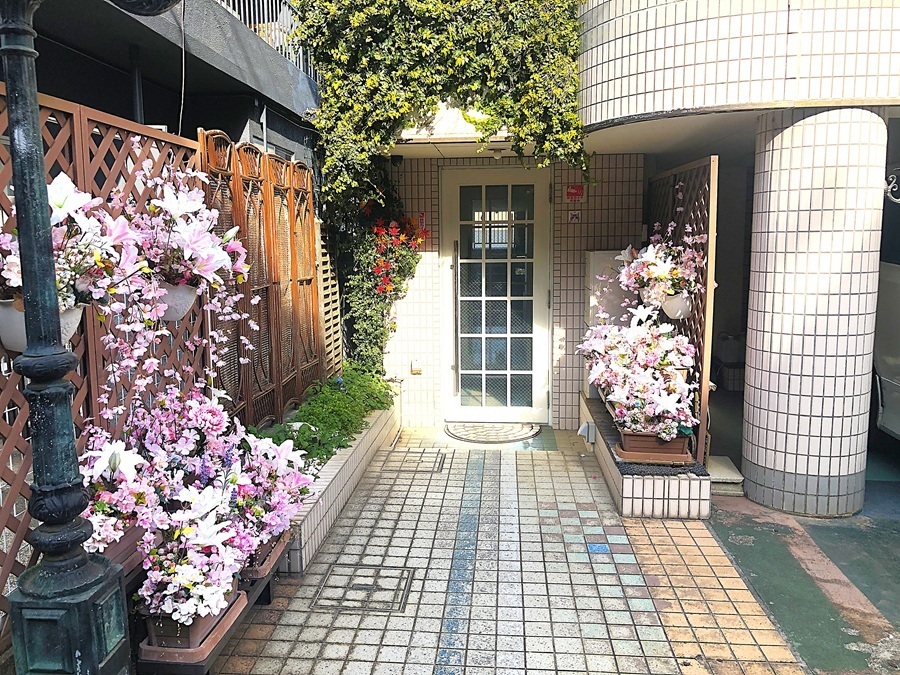 それを通り過ぎ、二軒目の黒い建物の先の建物です。丸いクラシカルな街灯が目印です。街灯の奥の白いドアーが入り口です。